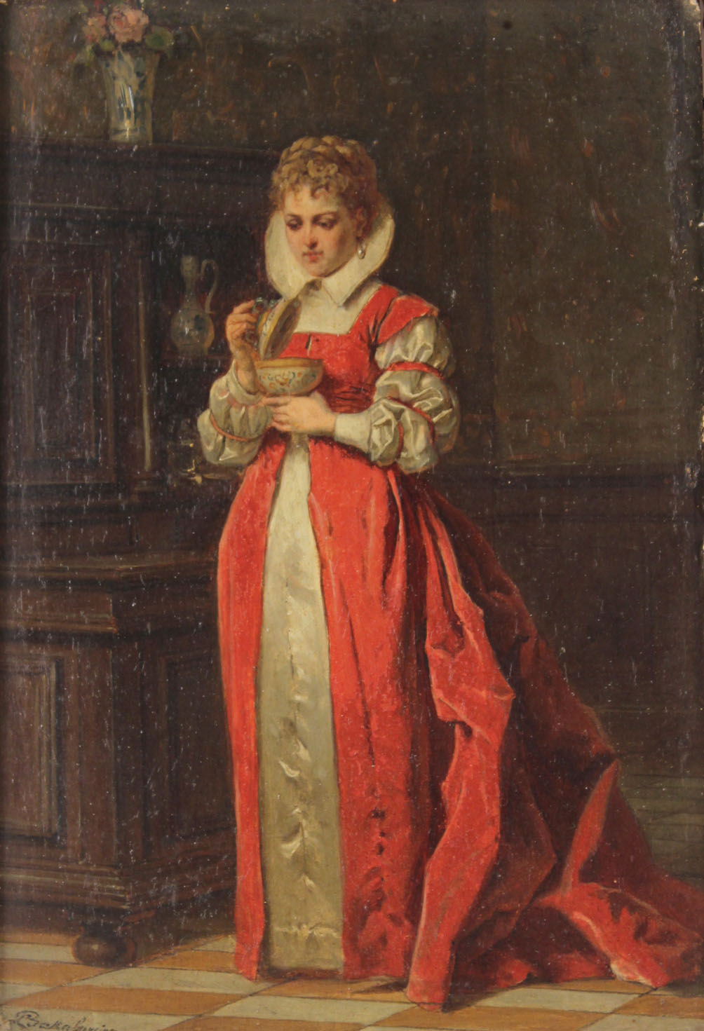 Lot 3794686. Oil on Panel Portrait of a Lady, Bakalomier, Continental,early 20thC. Signed l.l. Bakalomier. Panel size:7″h x 4 3/4″w. Estimate $800.00 – 1200.00. Sold $2,125. iGavel. 3/24/15.