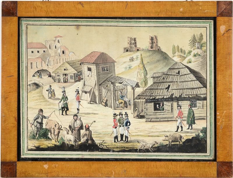 Lot 965. Iwaszkiewicz, W. (Polnischer Maler, E. 18. Jh.) Aquarell/Papier. “w. Wilnie”, Szene mit dörflichem Ambiente vor der Stadt Vilnius mit verschiedenen Personen, in der Mehrzahl Soldaten, im Hintergrund auf einem Hügel die Ruinen der Burg. Personen u. Gebäude teilw. nummeriert. Rücks. dazu Legende mit namentlicher Aufführung der Personen u. ihres Dienstgrades. Im Bild sign., betit. u. dat. 1791. Rücks. sign., betit. u. dat. Erhaltungsmängel, Papier knickspurig, gebräunt u. part. l. fleckig. 25 x 35 cm. Rahmen. (17). Opening 220. Euro. Kunstauktionshaus Leipzig. 5/2/15.