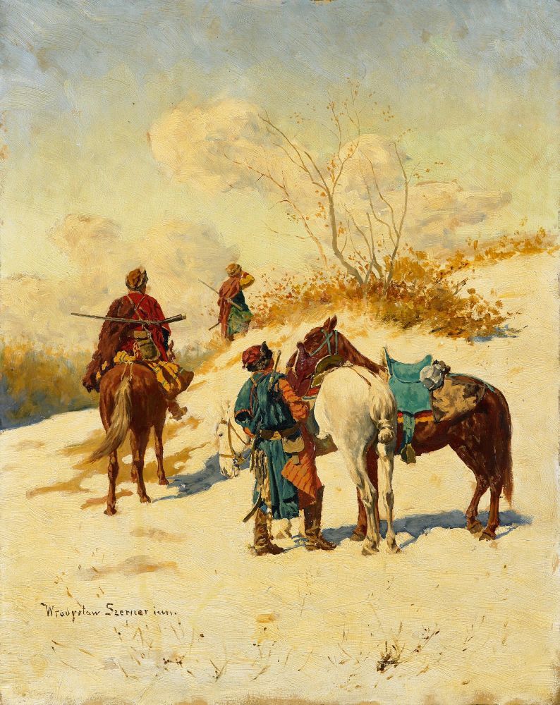 Lot 739. SZERNER, WLADYSLAW 1836 Warsaw – 1915 Munich. Cossack Horsemen in the Snow. Oil on wood. 50 x 39,5cm. Signed lower left: Wladyslaw Szerner iun.