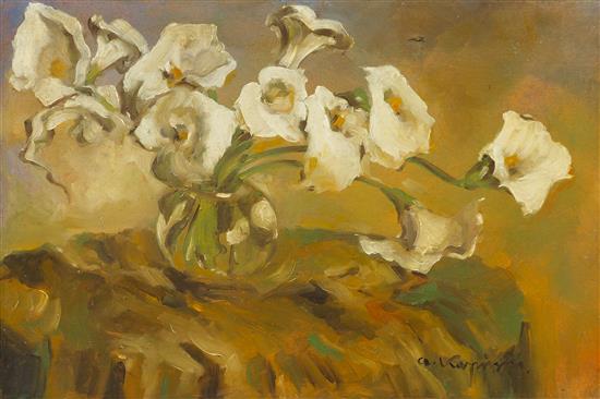 Sale 372 Lot 116. Alfons Karpinski (Polish, 1875-1961). Still Life with Calla Lillies, oil on board; signed A. Karpinski (lower right); signed (verso); 8 x 11 inches. Estimate $ 800-1,200
