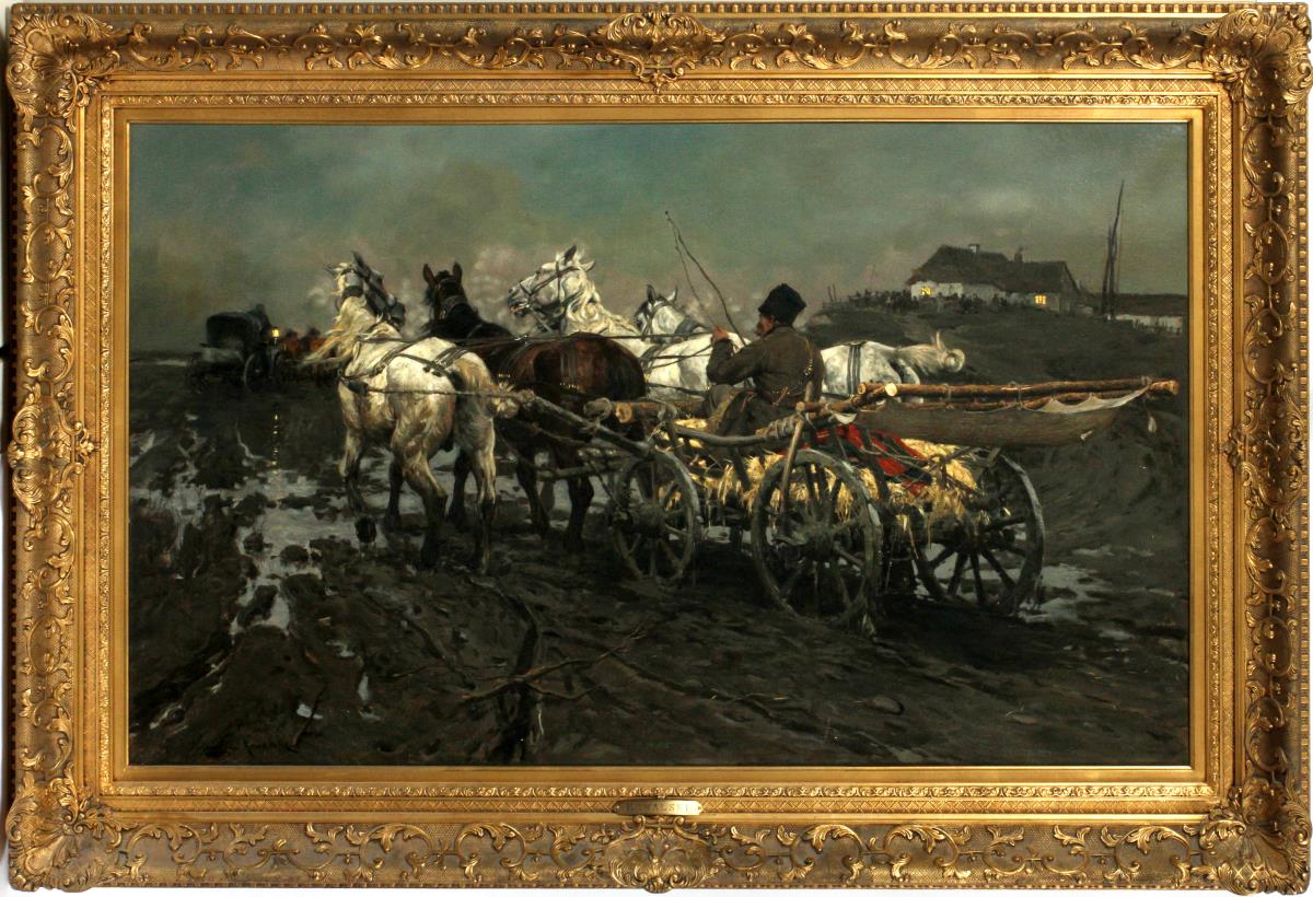 Lot 52022. ALFRED WIERUSZ KOWALSKI (POLISH 1849-1915), OIL ON CANVAS, H 29″, W 48″:Signed lower left. Depicting a man riding a hay cart pulled by team of four horses, following a coach. Cottage in distance with many figures walking towards it on muddy road. In elaborate, gilt wood and gesso frame. Estimate $75,000-150,000. DuMuchelles. 5/17/15.