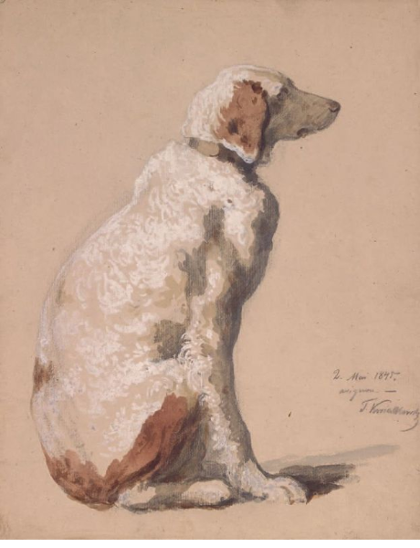 LOT n°231. TEOFIL KWIATKOWSKI(Pultusk – Pologne, 1809 – Avallon, 1891). Chien assis de profil(tourné vers la droite) Aquarelle sur papier, signée, datée et située en bas à droite 2 Mai 1845./avignon-T. Kwiatkowski. Référence au verso III/34. Haut. 29,8-Larg. 23 cm.
