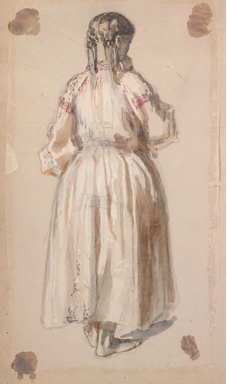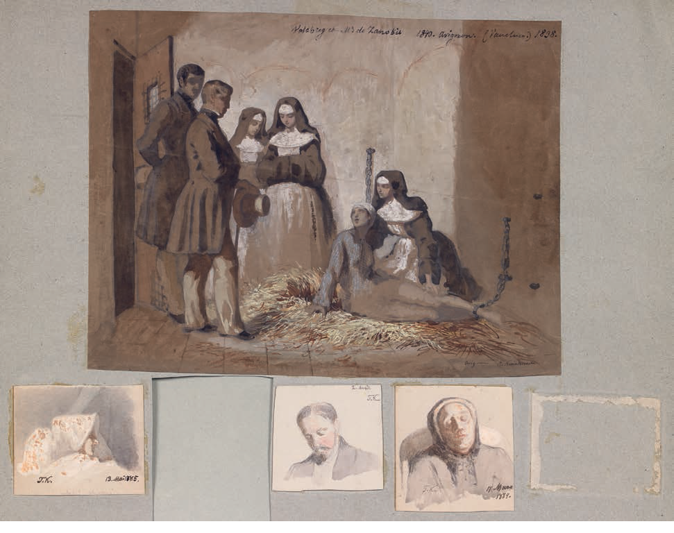 Certains calques de copies de maîtres anciens (Raphaël, Le Sueur (Les Muses), Fra Bartolomeo, Ingres) portent une mise au carreau (deux des copies semblent avoir été commandées par la princesse de Beauvau). Kwiatkowski effectua très vraisemblablement un voyage en Angleterre en 1849, peut-être en compagnie du prince Adam Czartoryski ou sous sa recommandation, ce dont témoigneraient les esquisses d’un portrait de Lord Dudley Coutts Stuart (1803-1854). D’autres portraits portent la mention Worthing near Brighton et la même date de 1849. NB : Il est erronément précisé sur la couverture Album de dessins de Theodore Kwiatkowski. Haut. 47 – Larg. 30 cm.
