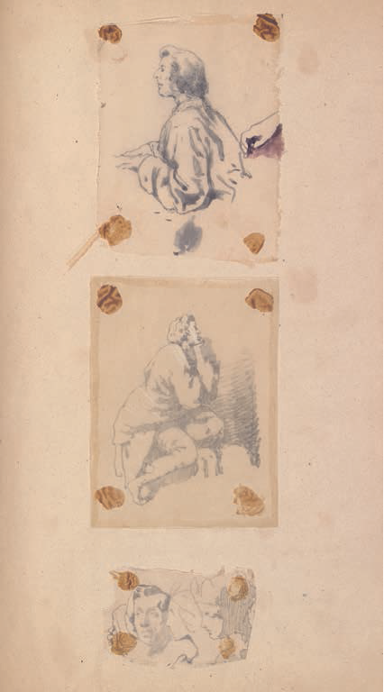 Lot 272. ALBUM DE DESSINS. 87 feuilles. L’album est constitué principalement de dessins ou d’esquisses au crayon ou à la plume sur des feuilles de papier calque de différents formats. Ces calques ont été ensuite collés dans l’album, souvent à l’envers afin de protéger les dessins. Ils sont parfois accompagnés d’annotations concernant le sujet, la date, le lieu. Les sujets sont divers : paysages, animaux, scènes religieuses, portraits (dont celui de Chopin en tenue d’intérieur, à cinq reprises, celui de Mme Belgrand daté 1848), copies de maîtres anciens. Parmi les études préparatoires, la figure de la Muse mazovienne de Chopin pour l’oeuvre intitulée Polonaise de Chopin. Bal à l’Hôtel Lambert (1859, Musée national de Poznan, Pologne), est représentée deux fois dont une dans une version aquarelle
