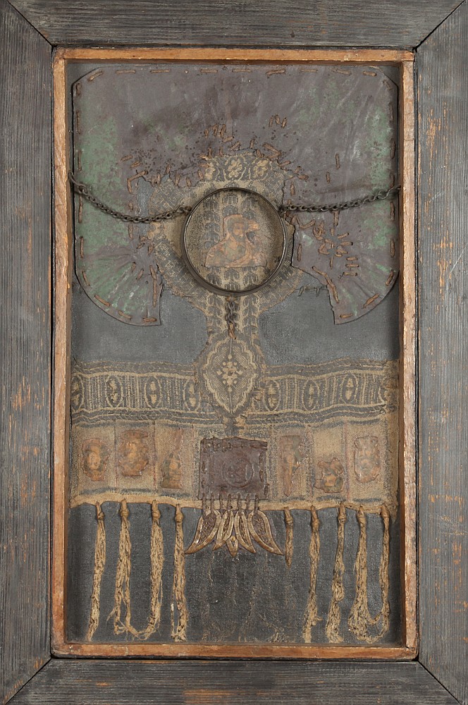 Lot 679. DANUTA URBANOWICZ (Polish, b. 1932). POZEQMANIR KAWALERYSTY, signed, titled and dated 1964 on label verso. Mixed media collage on canvas – Framed, 21 in. x 12 1/2 in.