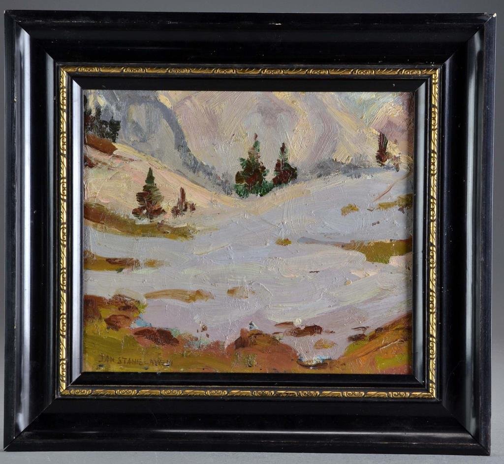 Lot 4589. Malecki, Wladyslaw Aleksander: Dorflandschaft mit Prozession. Öl/Leinwand, links unten signiert. Kleine Bauernfamilie auf der Wiese vor dem ärmlichen Haus mit Blick zum Gehweg, auf dem sich eine Trauerprozession Richtung Dorfkirche bewegt. Leichte Altersspuren. 52 x 79,5 cm, Goldstuckrahmen 68 x 96 cm. Th/B.: Polnischer Landschafts- und Tiermaler (1836 – 1900), lebte um 1872/79 in München. Bilder im National-Museum Krakau und in Warschau.