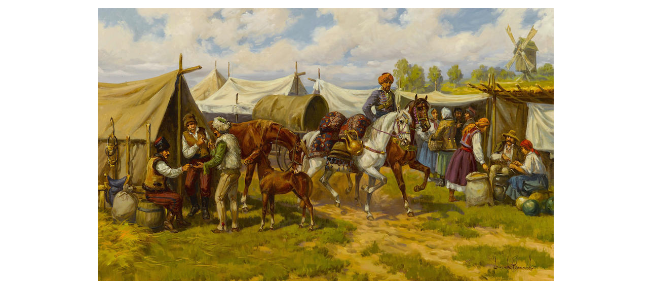 Lot 7145. Leszek Piaseck (Polish, 1928-1990). The caravan market; signed ‘Leszek Piaseck’ (lower right), oil on canvas, 27 x 47 1/2in