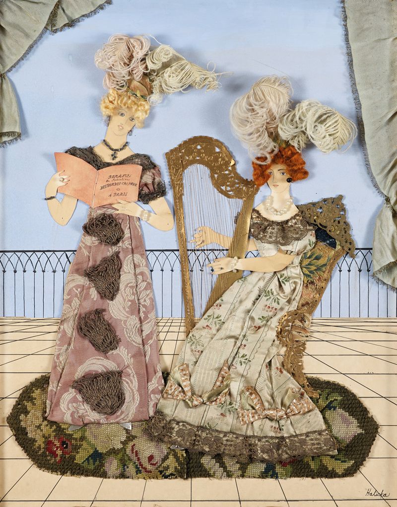 Lot 54. Alice HALICKA (1895-1975). Les musiciennes. Technique mixte, gouache, encre et collage de tissus, plumes, perles, sur papier marouflé sur toile, signé en bas à droite; 61 x 50,5 cm