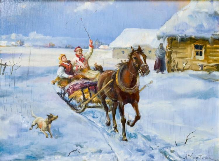 Lot 6115. Alfred von Wierusz-Kowalski (1849-1915), Title: Untitled, Medium: Oil, Media: Board, Year or Era Produced: Unknown, Signature: Lower right, Sight Area Approximate Measurement: 19.25″ x 14.5″, Frame Approximate Measurement: 21″ x 25.75″ x 2.75″, Weight: 6 lbs; Note: Cracking evident in painting. Painting purchased in 1960s by former Polish diplomat in London. Cleaned and conserved in 1970’s by member of the National Museum in Warsaw.