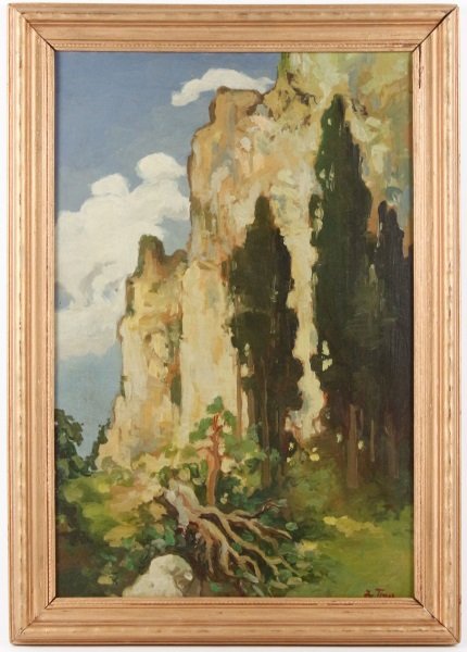 Lot 462. Julian Falat (Polish/ Austrian, 1853-1929). “Bystra Hillside”, watercolor on illustration board, signed and titled lower left. Horizontal landscape painting depicting an autumn landscape with profile view of a hillside running diagonally down from left to right with three clusters of trees growing to foreground with their tops outside of the composition, the background with a line of full green trees fronting a blue to purple sky. Framed approximately 13.5″ x 17.5″, sight size approximately 9.5″ x 13.5″.