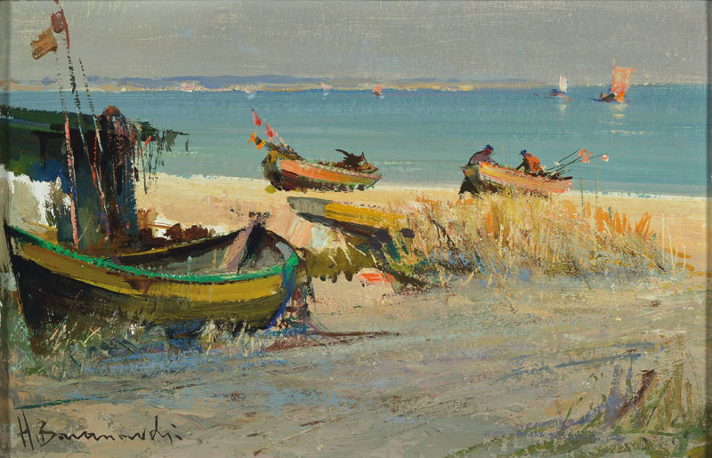Lot 6083. Henryk Baranowki, 1932-2005, beach view with boats and people staffage, oil / canvas, approximately 27.5x 40cm frame.