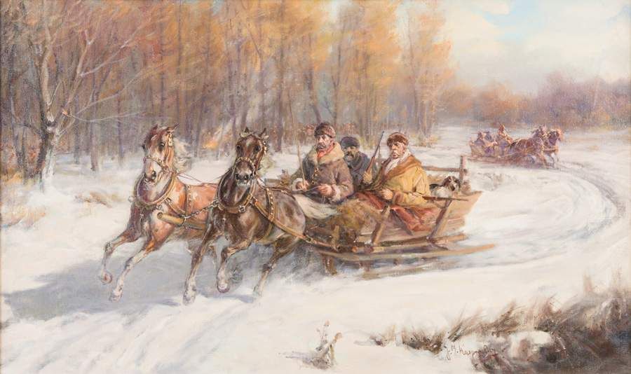 Lot 1717. JAN MAKSYMILIAN KASPROWICZ 1906 Schwersenz – 1986 Gdingen. Schlittenfahrt im winterlichen Wald – Große Jagdgesellschaft. Öl auf Leinwand. 60 cm x 100 cm. Unten rechts signiert J.M. Kasprowicz’. Rahmen.