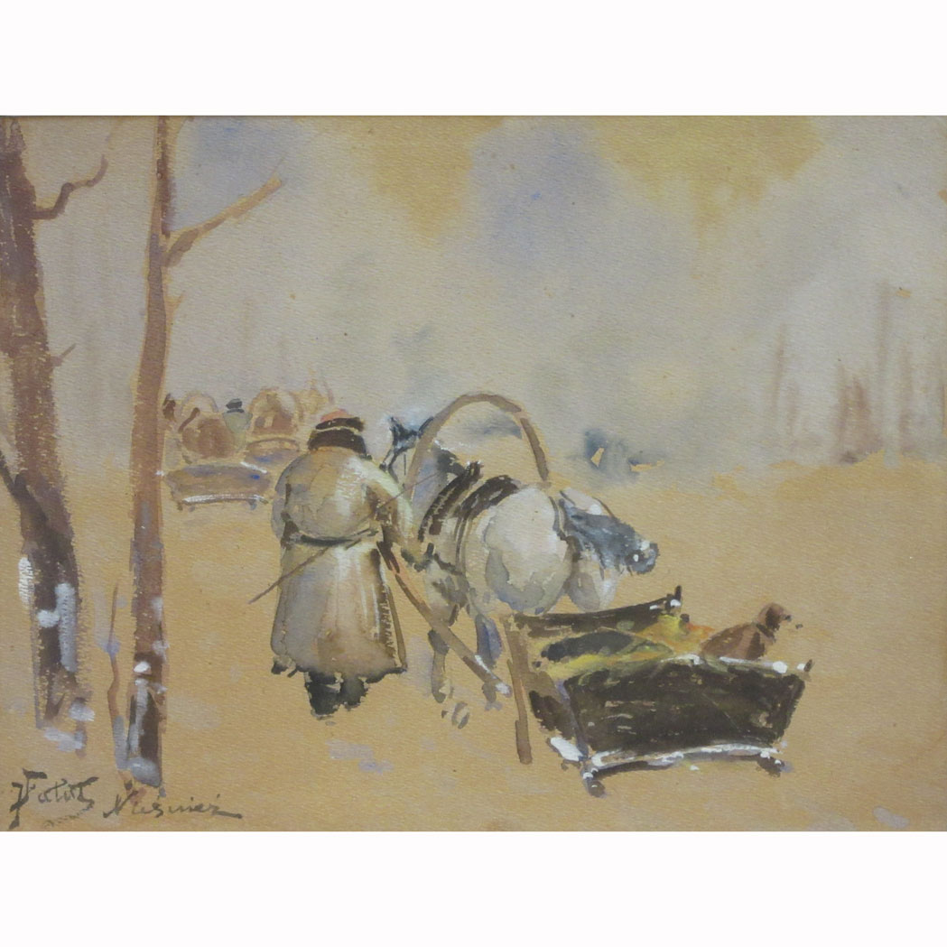 Lot 42. Julian Falat. Polish, 1853-1929. Hunting in Nieswiez. Signed with conjoined first initials JFalat and inscribed Nieswiez (ll). Watercolor heightened with white on paper. Sight 9 3/8 x 10 11/16 inches