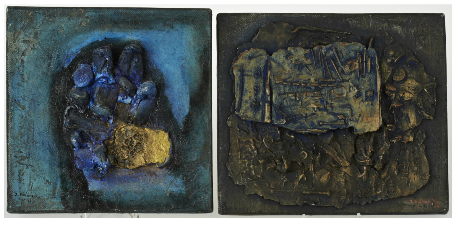 Lot 627. Tadeusz Was (Polish, 1912-2005) – ‘Abstract figure in a hat’ and ‘Abstract figures’ A pair of signed limited edition soot cuts, each no 1/1, each approx 21x17cm, both framed. NB: Story has it that the process of soot cut was discovered by Tadeusz whilst stationed in the desert during World War II, he apparently held orange peel over a burning oil lamp and the resulting soot produced formed a perfect impression when in contact with paper.
