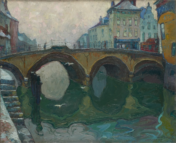 Lot 321. Huile sur toile: Signée et datée: M. de Rakowsky 1929. Vol de mouettes sur le pont de Malines. Dimensions : 54 x 65 cm