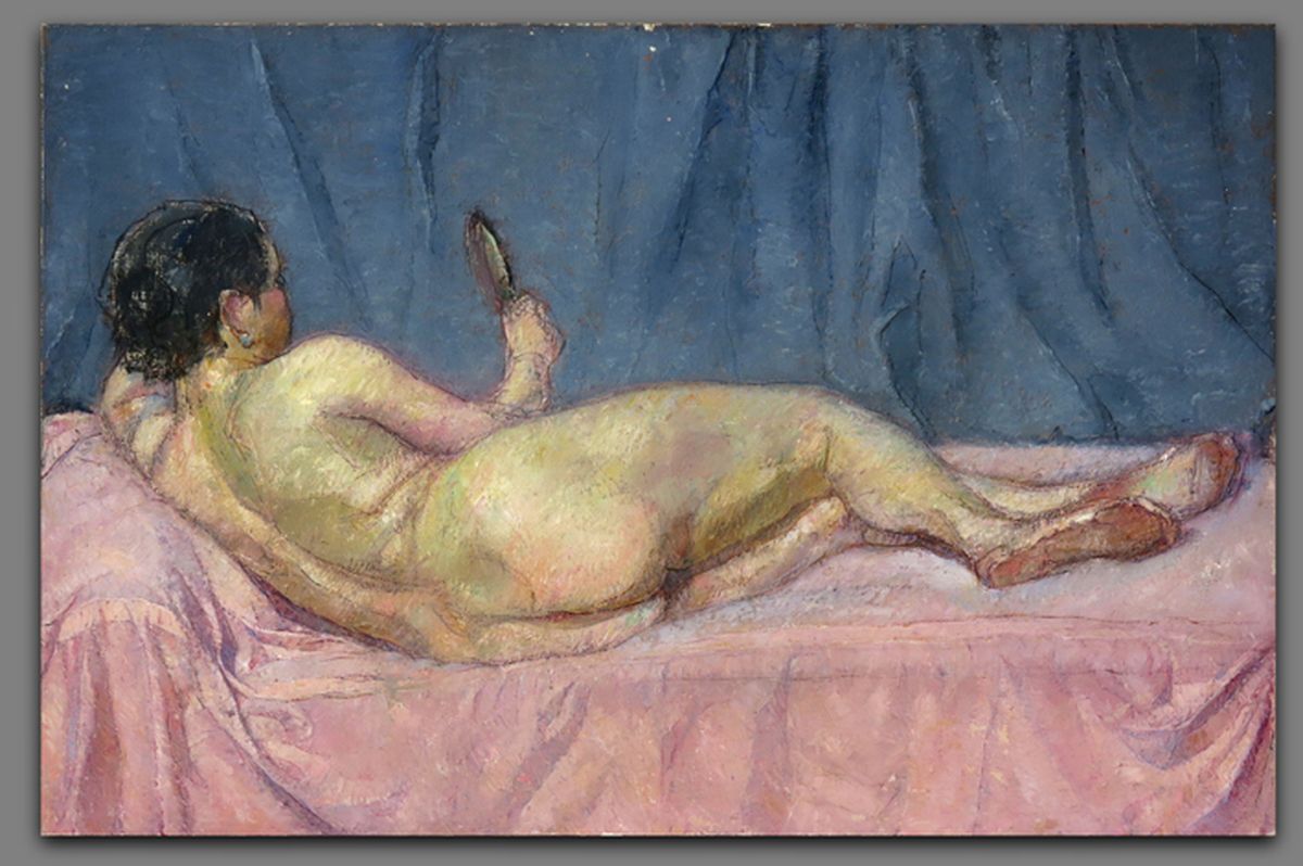 Lot 413. DE RAKOWSKY MECISLAS (1887 – 1947) olieverfschilderij op doek : “Liggend naakt” – 80 x 100 met atelierstempel op verso.