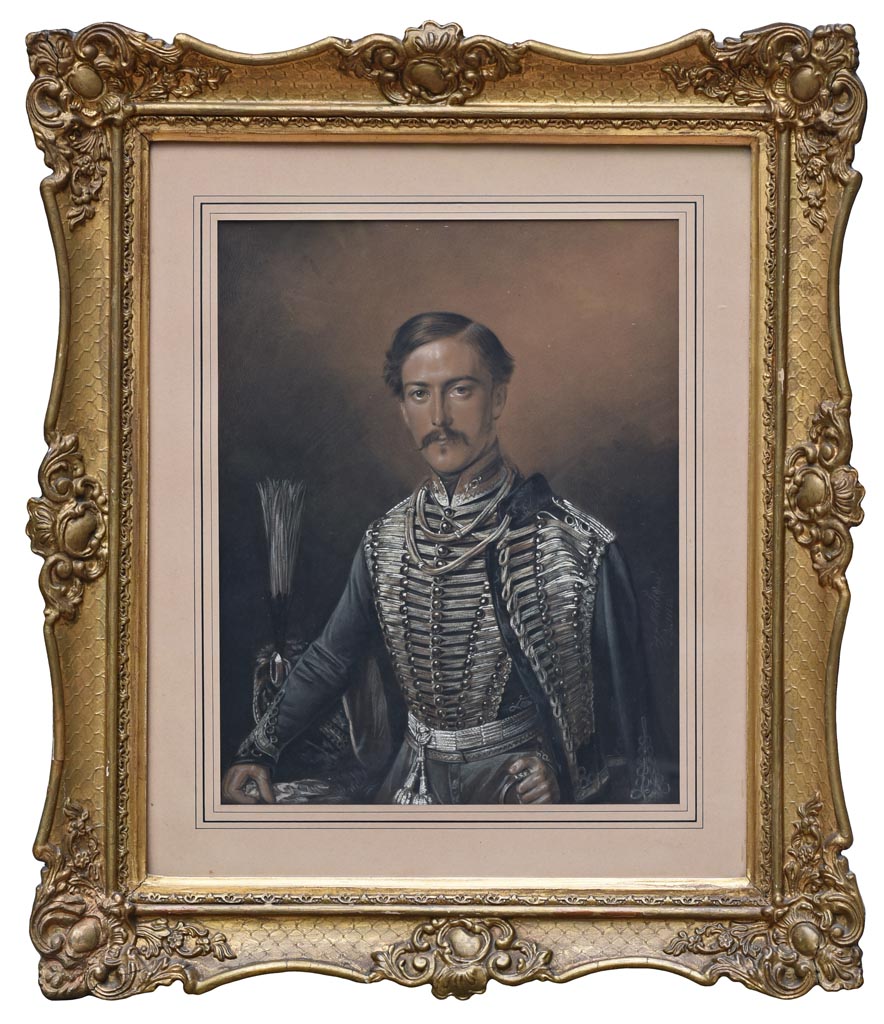 Très belle technique mixte sur papier « Hussard », signée et datée « Posen 1852 » sur le côté à droite, actuellement Poznan en Pologne ; 36,5 x 29,5 cm