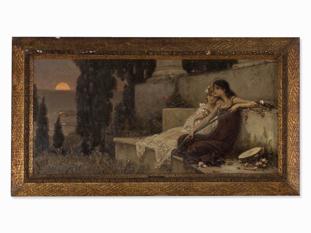 Two dreamy musing women are depicted on a terrace, that appears to be antique, with a from cedars seamed sea on the background, in which the orange-red sun incandescently sinks. This is a characteristic-symbolic painting of the artist, which imparts the light atmosphere almost impressionistic. Kotarbinsky often composes his poetic, allegoric depictions on terraces, where he intensifies the panorama impression through the wide format of the painting. The bright light atmosphere and the subtle melancholy let the mostly in dark colors made painting to be related to the Fin de Siecle and the Art Nouveau.