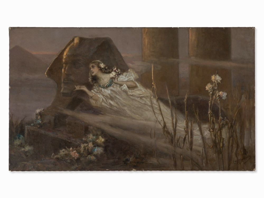 This is a characteristic symbolic painting of the artist, which imparts the light atmosphere almost impressionistic. Kotarbinski chose for this painting, as often, the Egypt’s pyramids as a curtain for his poetic allegorical depictions.