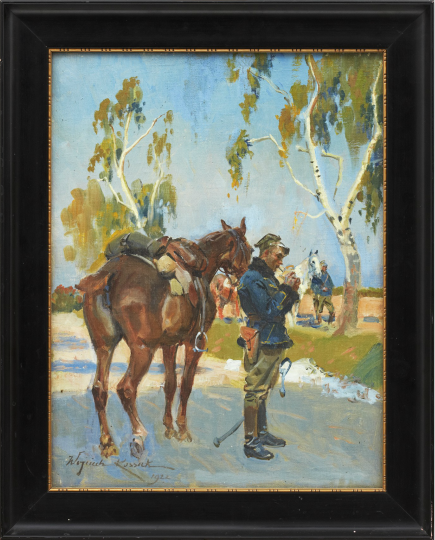 Lot 181. Wojciech Kossak Poland 1857‑1942. Soldier with his horse. Signed and dated Wojciech Kossack 1922. Oil on canvas laid on panel, 42 x 32.5 cm.