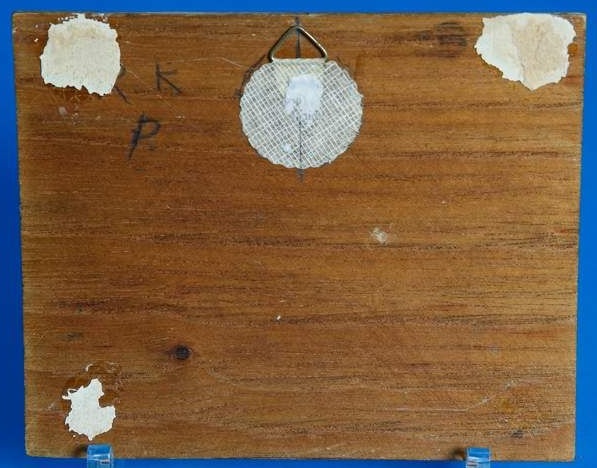 As is almost invariably the case, Bellotto’s version is significantly larger than the prototype, which measures 18 ½ x 31 ⅛ in. Also characteristic of Bellotto’s style rather than his uncle’s are the application of the sky in diagonal strokes from upper right to lower left, the formula for the ripples in the water, and the widespread use of incising to establish the main lines of buildings and to run straight down for the reflections thereof. This last is not as evident as it is often in Bellotto’s work of this period due to the unusually good condition of this painting. The reflections themselves are executed in small horizontal strokes. The colouring is distinctive, with a copious use of black and a fairly cold light. The pale blue of the shirt of the man in the sailing boat on the left and the mauve of the shirt of the man seated on the steps on the right are characteristic Bellotto colours. The faces of the figures have tiny pink dots for noses and black dots for eyes and mouths. The young painter’s able hand is already able to render the contrasting textures of stucco, stone and sailcloth, and roof tiles are covered in tan dotting throughout.