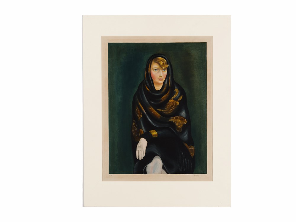 An expression of exasperation adorns Sonia, the subject of Moïse Kisling’s portrait of the same name. Wrapped in an ornate shawl with a gold bracelet and white gloves, it is clear that this woman is of high status. Executed in a more realistic manner than the surreal depictions of female nudes for which the artist is noted, this work highlights the artist’s technical skill as a printmaker, rich with color and detail.