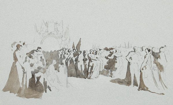 Polonaise de Chopin. Chopin am Klavier, umgeben von Zuhörern. Studie zum gleichnamigen, in mehrfachen Varianten ausgeführten Aquarell. In Braun lavierte Bleistiftzeichnung. Auf blaugrauem Bütten. 22 x 36,7 cm. An drei Ecken auf Unterlage montiert. Der polnische Maler Kwiatkowski war eng befreundet mit Frédéric Chopin, dessen Porträt er mehrfach malte. Die die Dramatik des Hell-Dunkel raffiniert erarbeitende Studie zeigt in der linken Bildhälfte Chopin am Klavier, nur mit wenigen Bleistiftstrichen erfasst. Er ist umgeben von in losen Gruppen angeordneten Damen und Herren, die meist stehend und in feine Gewänder gekleidet dem Komponisten zuhören. Von dem mehrfach, in Varianten ausgeführten Aquarell, das unter den Titeln „Polonaise de Chopin” und „Bal à l’Hôtel Lambert” bekannt ist, befand sich eine Fassung bis 1927 im Polenmuseum in Schloss Rapperswil (seither Warschau), eine andere Fassung wird in Posen im Nationalmuseum aufbewahrt.