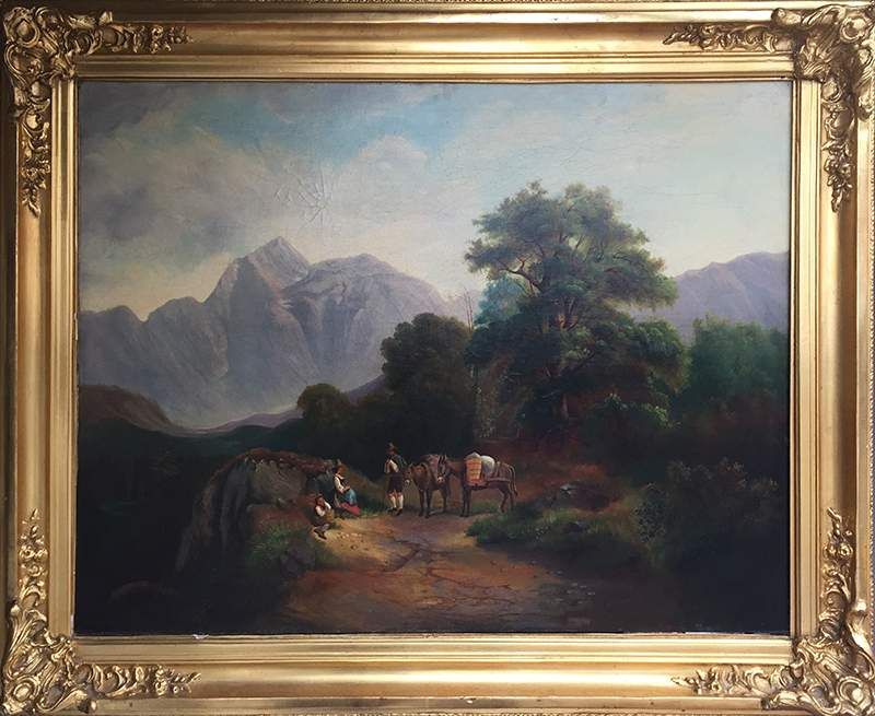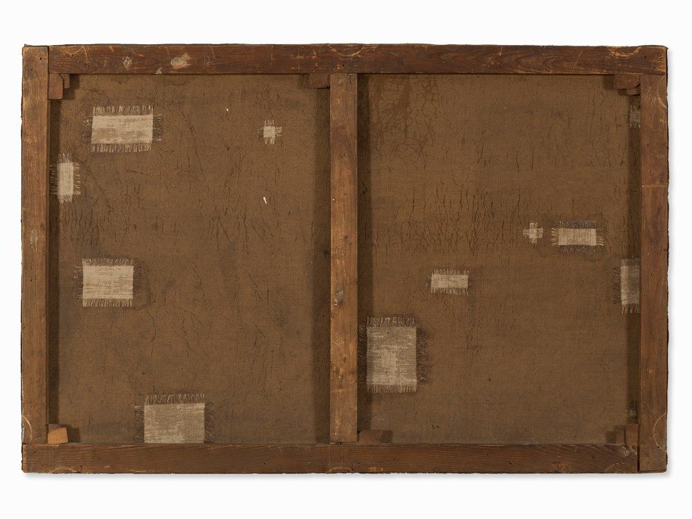 The painting is in good condition, showing minor craquelue and pressure marks from the stretcher. The varnish has been renewed. The inspection under UV light reveals a few strengthening strokes of retouching. The frame shows minor wear. The dimensions are 53.5 x 63 cm, while the frame measures 72 x 82 cm.
