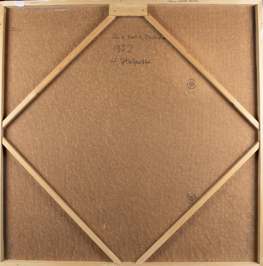 Oil on hardboard-wood box; H 100 cm, W 100 cm, D 3 cm; verso signed ”H. Stazewski”, dated