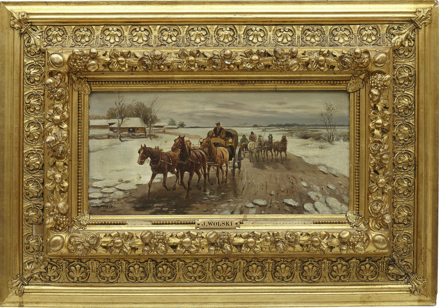 “Reiter in verschneiter Stimmungslandschaft” Öl auf Leinwand, signiert, 81×55 cm (32 x 21 1/2 in), profilierter Rahmen, Literatur: Thieme-Becker, Münchner Maler im 19.Jahrhundert, Boetticher: Malerwerke des 19.Jahrhunderts, Ostrowski: Die polnische Malerei vom Ende des 18.Jahrhunderts bis zum Beginn der Moderne, Saur: Allgemeines Künstlerlexikon