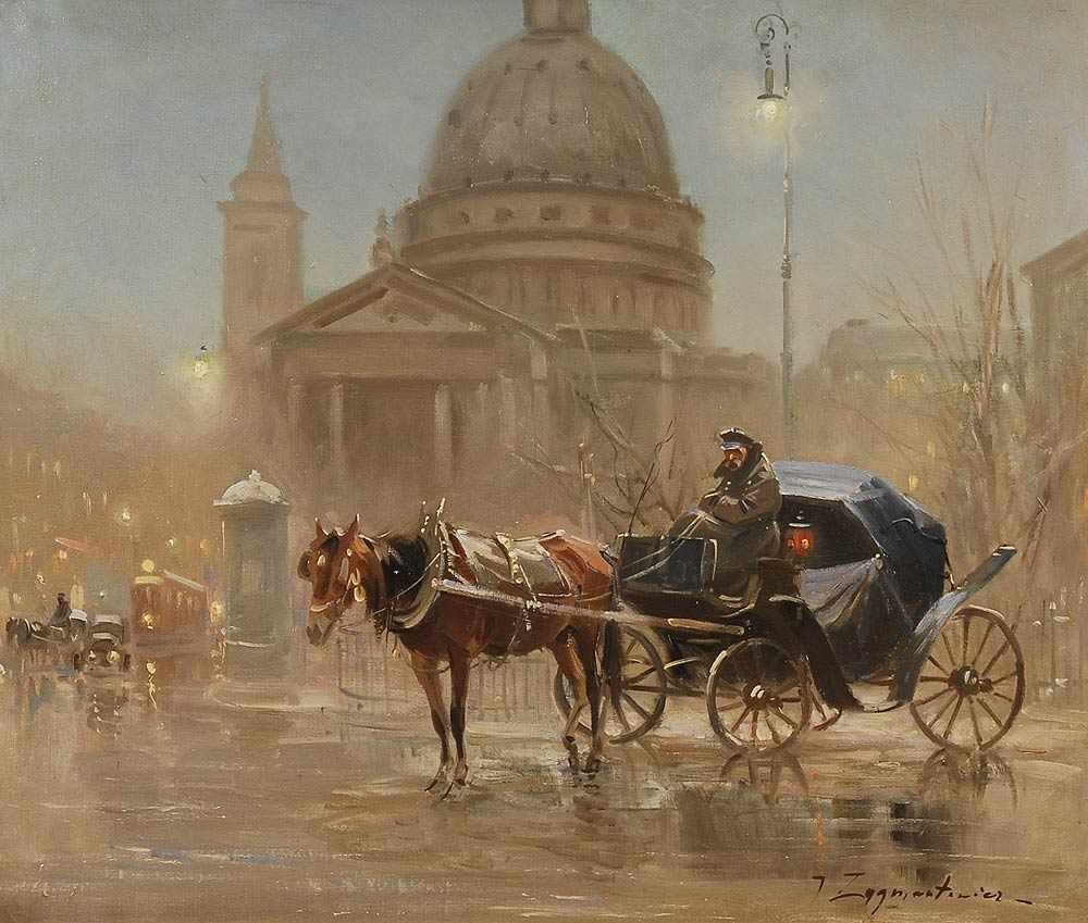 Lot 4740. Zygmuntowicz, Ignacy: Frierender Kutscher. Öl/Leinwand, rechts unten signiert, auf Rahmenschild bezeichnet, verso bezeichnet und als “Warschau” betitelt. Wartender Kutscher unter einer Laterne, vor einem Gebäude mit hoher Kuppel, bei regnerischem Wetter. 55 x 65 cm, Silberstuckrahmen 69 x 79 cm. Polnischer Genremaler (1875 Warschau – 1947 Lodz), auch bekannt als Czeslaw Wasilewski.
