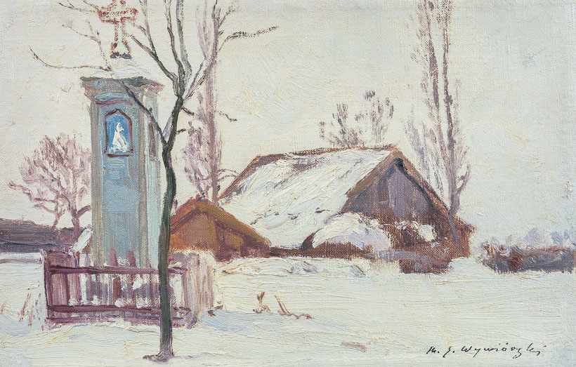 Zwei kl. Winterlandschaften. a) Wegkreuz mit Ikone und Bauernhaus. b) Einsames Gehöft. Sign. Lwd., aufgezogen. 17,5×29 bzw. 21,5×31 cm.