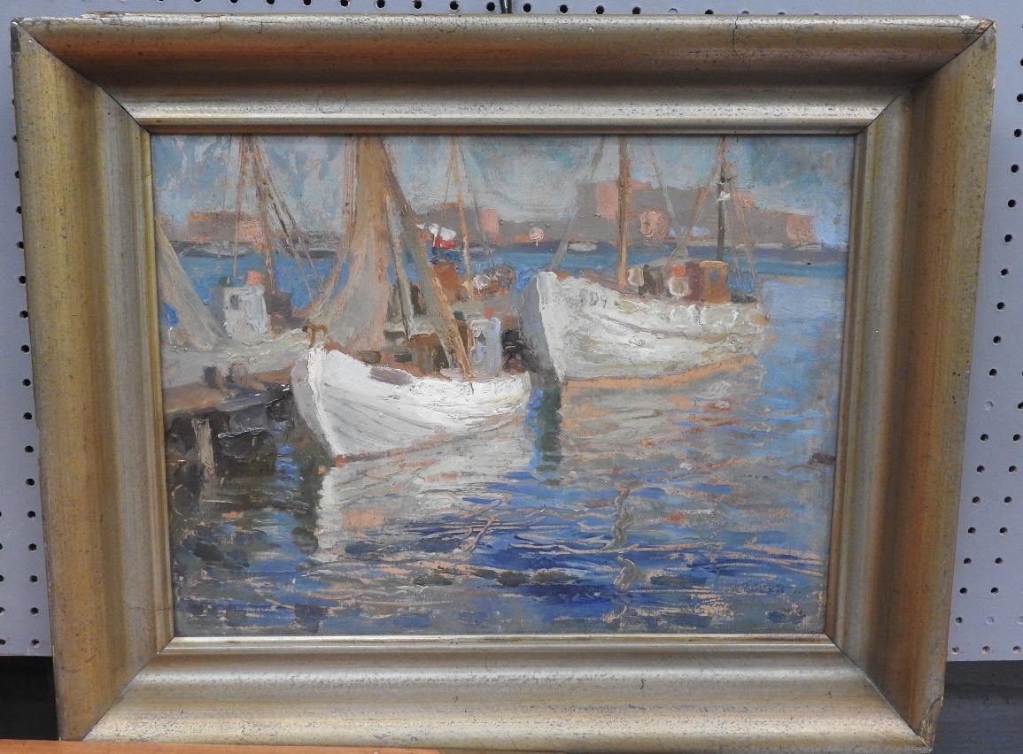 Lot 122. Jan Gasinski (Polish, 1903-1967) An oil on canvas in the Impressionist manner, illustrating boats docked at Port Gaynia, 1936, signed lower right, 29cm x 37cm, gilt framed, label to verso.