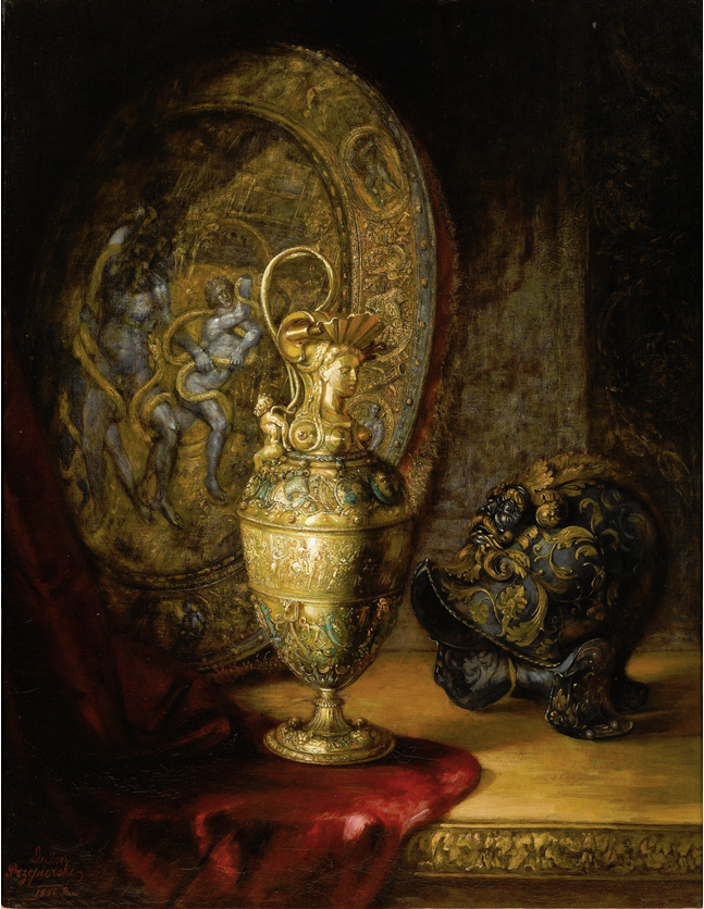 Le tableau représente l’aiguière dite de Charles Quint et un bouclier milanais d’apparat tous les deux conservés au musée du Louvre, Paris.
