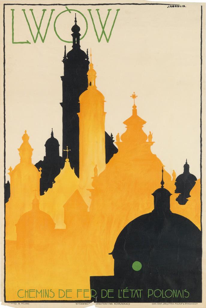 Lwòw has had a tumultuous geo-political history. Historically a prominent Polish, Ukrainian and Jewish city, it was one of the intellectual centers of Eastern Europe. Over the centuries, it has been fought over and claimed by the Hapsburgs, Russians, Poles and Germans. Poland took control of the city in late 1920, and it was part of Poland until the beginning of the Second World War when it was retaken by the Soviets and then again by the Germans. Norblin, in a silhouette style reminiscent of posters by Ludwig Hohlwein, depicts some of the city skyline’s most prominent structures: The Bernadine Cathedral and Monastery, the Clock Tower and the domes of the Assumption Dormition Church and the Dominican Church, amidst other spires and steeples. In addition to its size, architecture and cultural prominence, Lwow is now also infamous for the Jewish Ghetto established there during the Second World War, which was liquidated in June 1943. Simon Wiesenthal was one of the most prominent of the ghetto’s few survivors. Polish Poster 92, Biblioteki Glownej 178, Polska Sztuka Plakatu p. 79.