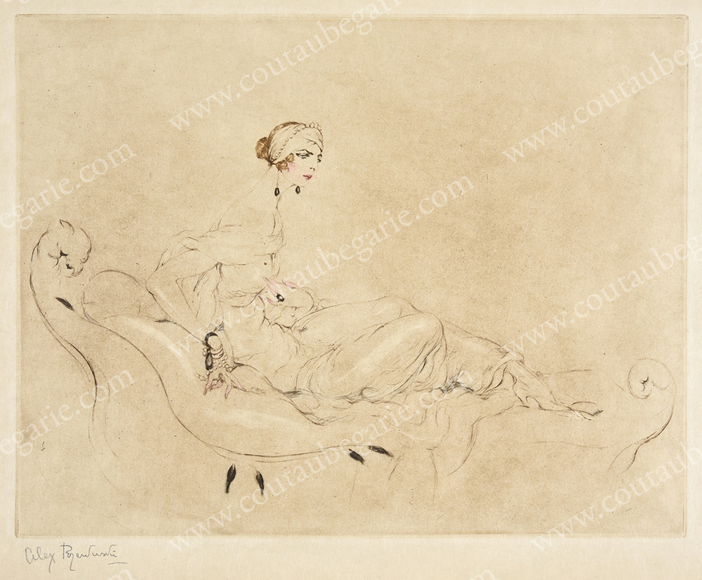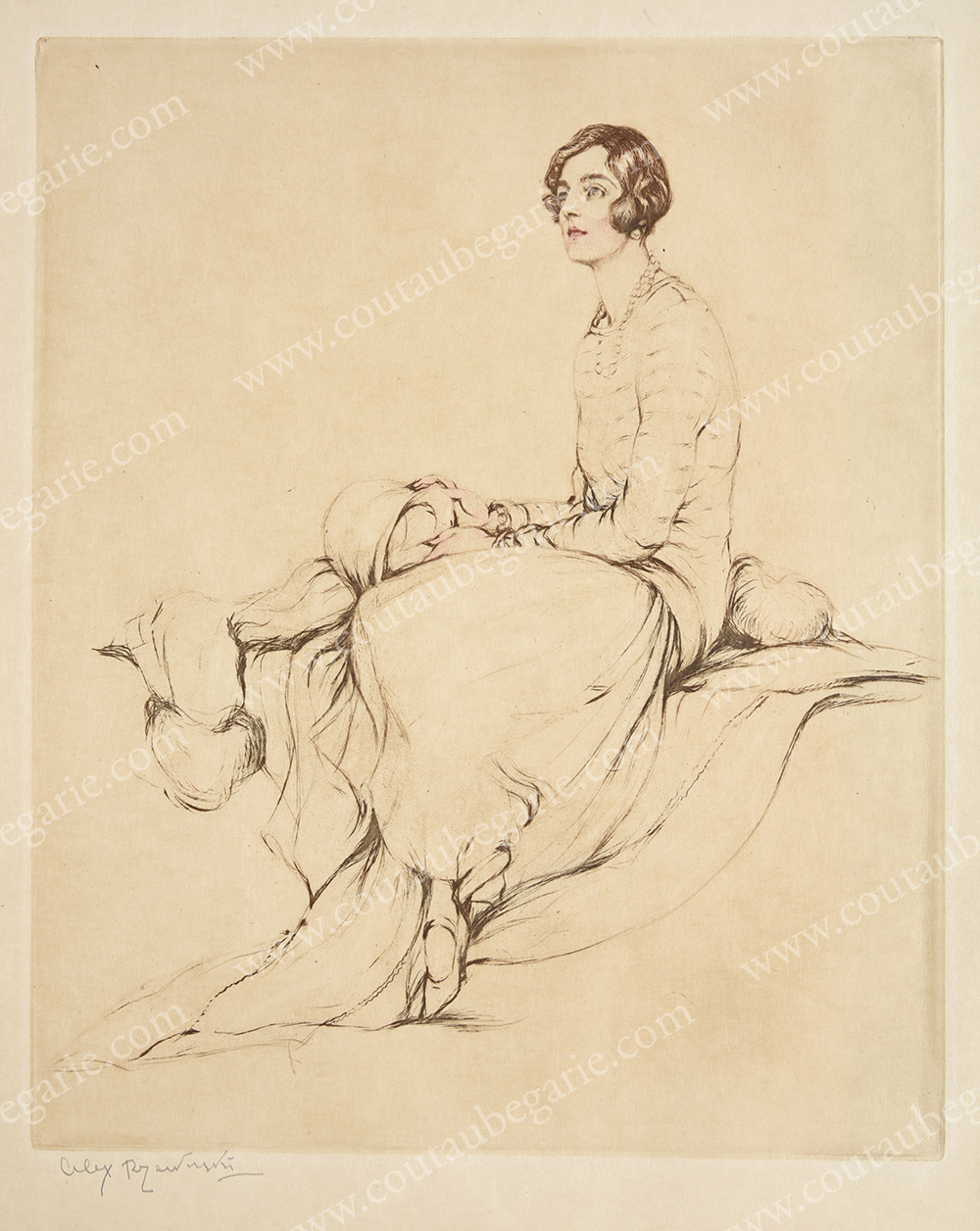 Historique: Aristocrate russo-polonais allié aux plus grandes familles européennes, Alexandre Rzewuski rencontre Félix Youssoupoff à Saint-Pétersbourg avant la Première Guerre mondiale. La déclaration de guerre les surprend d’ailleurs tous les deux à Berlin, alors qu’ils sont de retour d’un voyage en Italie effectué avec quelques amis. Fuyant la Révolution bolchévique, Rzewuski et Youssoupoff se retrouvent d’abord à Kiev en 1917 et 1918. Lorsque la ville tombe aux mains des Rouges, la famille Rzewuski gagne l’Italie par la Tchécoslovaquie tandis que le couple Youssoupoff quitte la Russie par la Crimée. Arrivé seul à Paris au printemps 1919, Alexandre Rzewuski se fait rapidement un nom comme illustrateur et collabore aux plus grandes revues du moment, en France comme en Grande-Bretagne : Femina, la Gazette du bon ton, Sketch, Punch, The London Illustrated News, Eve, etc. C’est cependant comme portraitiste (ayant recours comme Helleu à la technique de la pointe-sèche) qu’il se fait bientôt une réputation internationale. Il passera même pour l’un des artistes les plus chers du moment, devenant le portraitiste attitré de la Café Society naissante. Proche des milieux russes de la haute émigration, il est un familier de Félix et d’Irina Youssoupoff qui l’invitent régulièrement dans leur villa de Boulogne. Il a d’ailleurs fait le portrait d’Irina Youssoupoff. Les œuvres de Rzewuski sont recherchées car peu nombreuses. Sa période d’activité est en effet très courte : en 1926, lassé du monde, il choisit d’entrer dans les ordres et se fait Dominicain. Il meurt à Venise, en 1983. Un catalogue raisonné des œuvres et une biographie d’Alexandre Rzewuski sont actuellement en préparation par David Gaillardon.