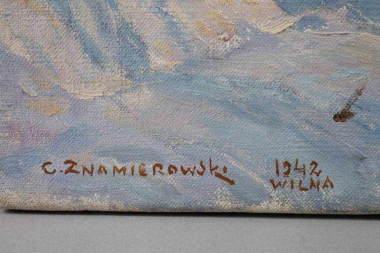 tief verschneite, von der Wintersonne beschienene Fichten, pastose Landschaftsmalerei, Öl auf Leinwand, links unten signiert, datiert und bezeichnet “C. Znamierowski 1942 Wilna”, rückseitig bezeichnet “C-KI-II Z-I XI -42” und Stempel “Czeslaw Znamierowski artysta malare WILNO, ul. ANTOKOLSKA 13-4”, leichte Erhaltungsmängel, ungerahmt, Maße ca. 38 x 55 cm. Künstlerinfo: litauisch-lettischer Maler (1890 Ludza bis 1977 Vilnius), 1912-17 Studium mit Unterbrechung an der Kunstakademie in St. Petersburg, 1926-29 Studium an der Universität in Vilnius bei Ferdynand Ruszcyc, Arkady Rylov und Nicholas Roerich, nachfolgend in Vilnius tätig, Quellen, Wikipedia und Internet.