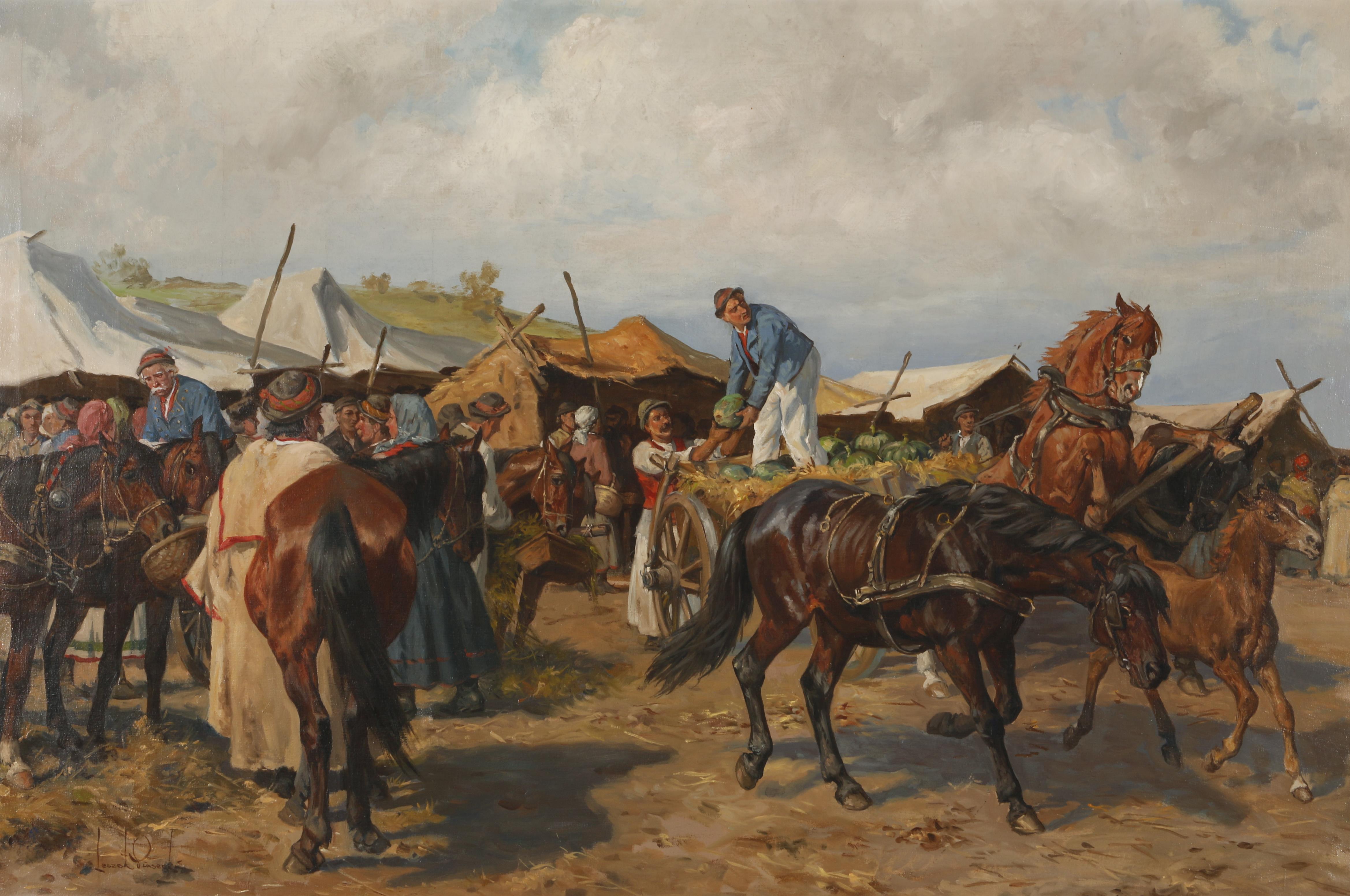 (Lemberg 1928-1990) “Markttag”, links unten signiert Leszek Piasecki, Öl auf Leinwand, ca. 81 x 121 cm, gerahmt, Rahmen etwas beschädigt