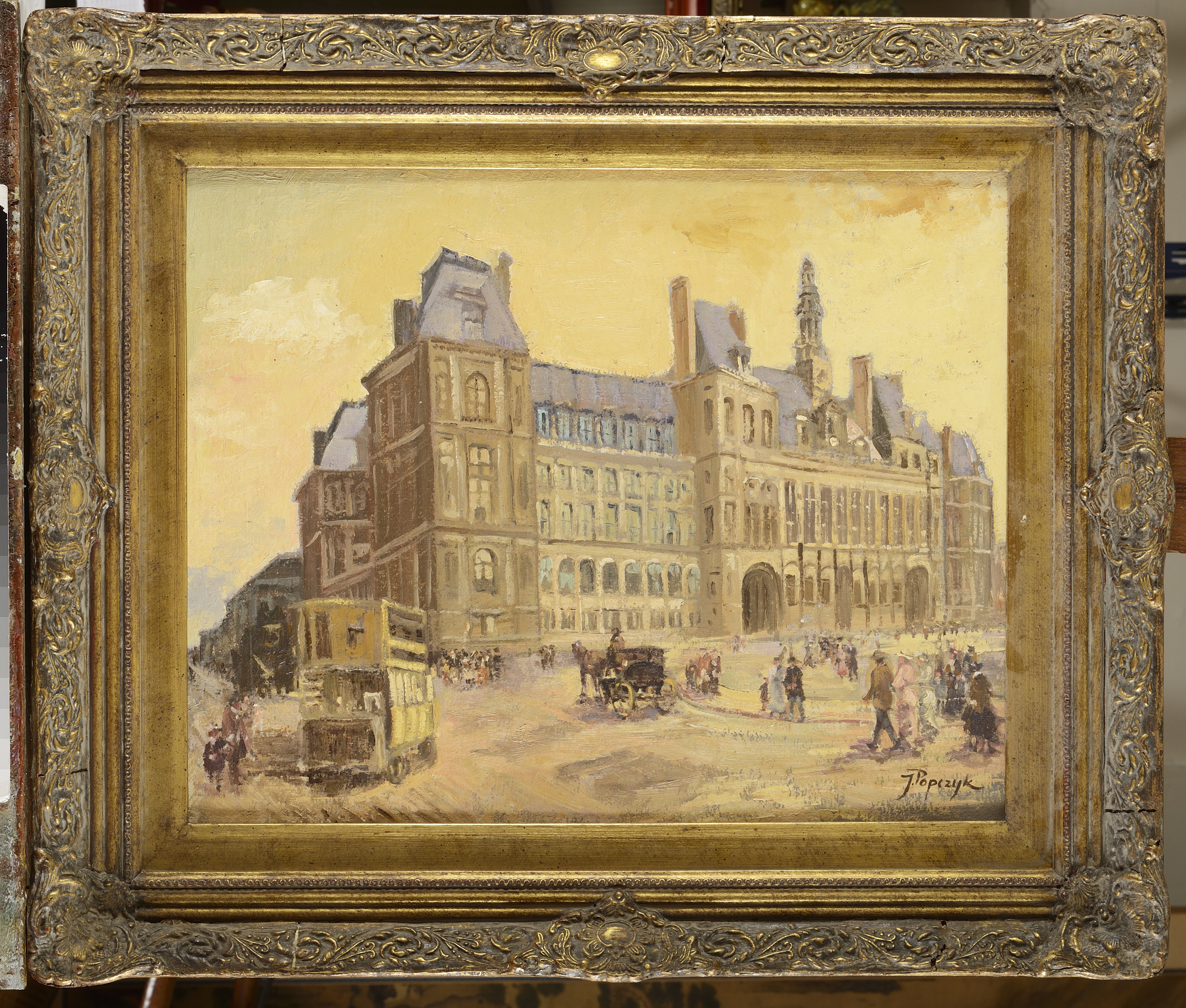 Lot 152. Jozef POPCZYK (1890-1971) L’Hôtel de Ville de Paris Huile sur carton, au dos une esquisse de rue Signée en bas à droite 40 x 49,5 cm Oil on cardboard, signed lower right, 14 3/4 x 19 1/2 in.