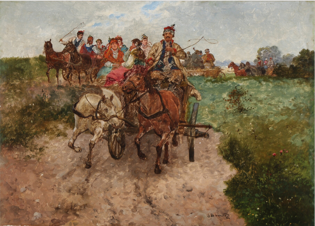 A wedding couple with follow in horse carriages. Signed S. Bieszczad. Oil on canvas laid on cardboard. 46 x 64 cm.