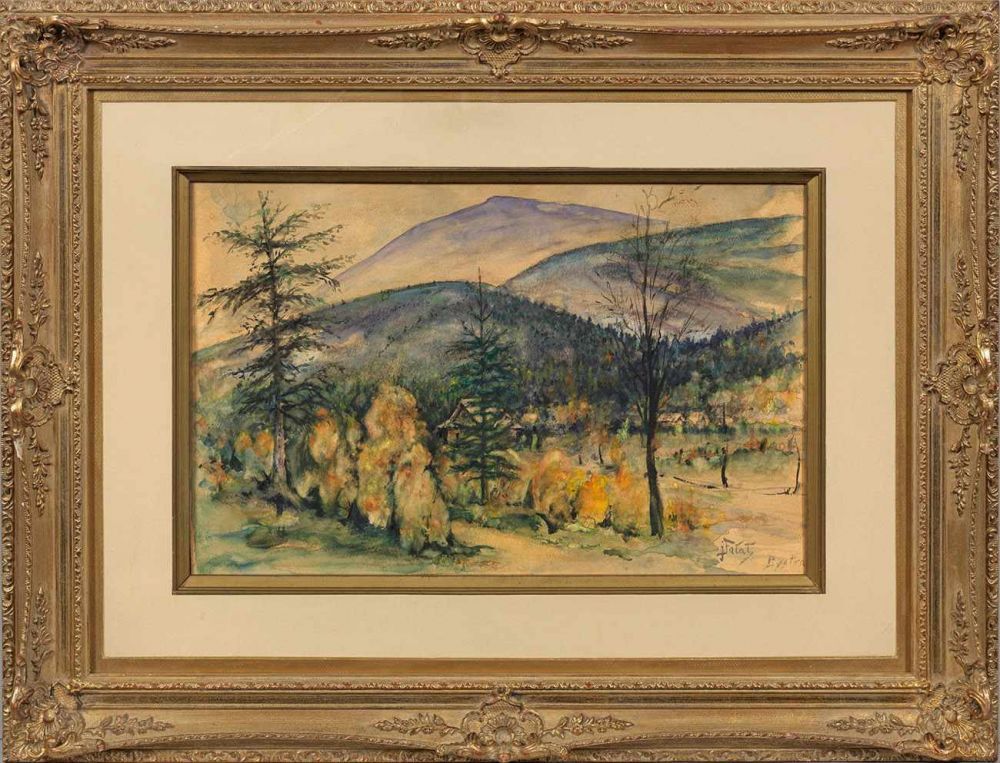 Impressionistische Landschaft des bedeutenden polnischen Malers, der an der Krakauer und Münchener Akademie studierte. 1895 kehrte er von seiner Tätigkeit als Hofmaler Kaiser Wilhelm II. nach Polen zurück, wo er bis 1910 die Krakauer Akademie leitete und reformierte. Ab 1910 in Bystra ansässig, nahm er die Malweise der französischen Impressionisten auf. Aquarell/Karton. R. u. sign. mit Ortsangabe Bystra. 29 cm x 47 cm (Passepartoutausschnitt). Rahmen.
