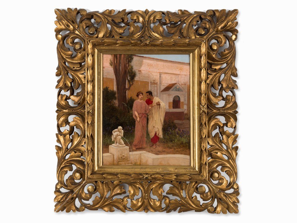 The painting is in an good condition, consistent with age. It shows partially fine craquelure. The inspection under UV light reveals some minor retouching on the edges and in the vestment of Ligia and in the upper part of the architecture in the background and the architecture of the fountain. The frame shows usual signs of age and wear.