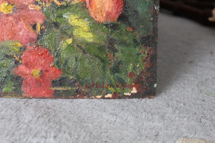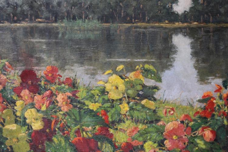 Lot 104 Kazimierz Plater-Zyberk (Poland 1878 – 1963) Oil on board painting of flowers by a reflecting lake. Signed lower right. Size: 19.5 x 26 inches.