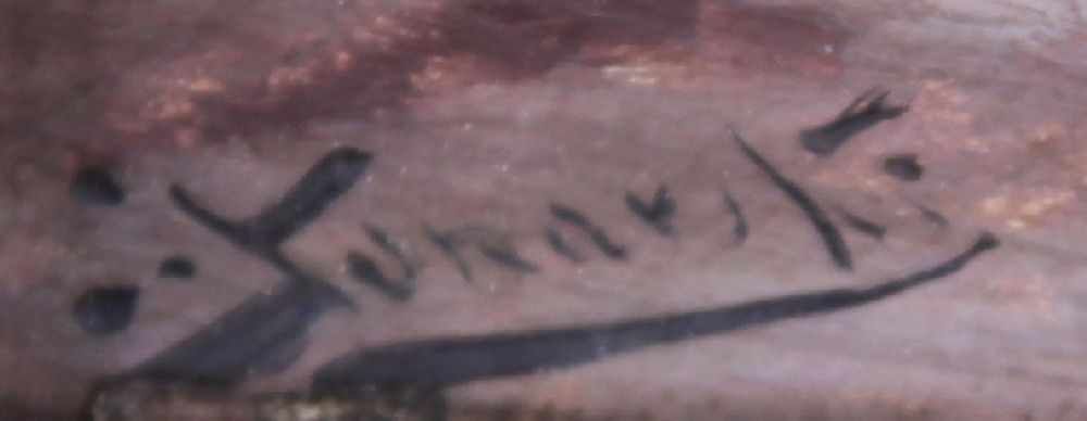 Lot 2002. Alfred von Wierusz-Kowalski (1849 Suwalki in Polen – 1915 München, polnischer Maler der Münchener Schule), Pseudonym J. Konarski, Kutschfahrt mit Einspänner und zwei lachenden Bäuerinnen, signiert, rückseitig bez. J. Konarski 19. Jh., Öl/Holz, Rahmenbauer-Marke München, 17 x 26 cm