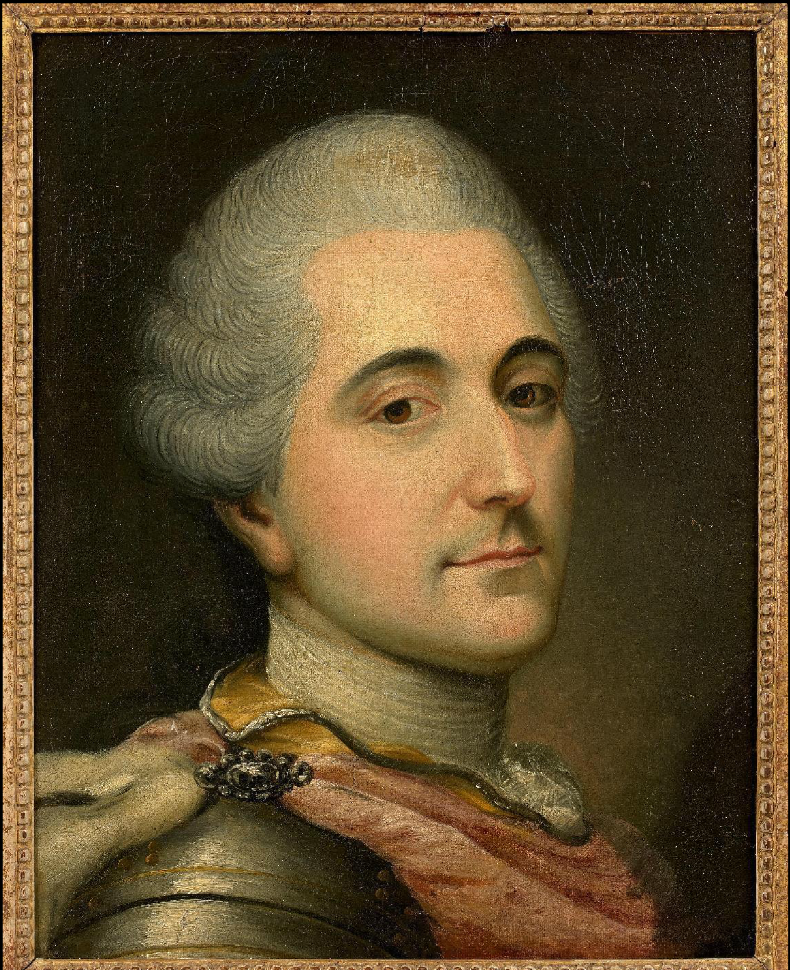 Lot 159. BACCIARELLI Marcello (attribué à) | Rome, 1731 – Varsovie, 1818 Portrait de Stanislas-Auguste Poniatowski (1732-1798), dernier roi de la Pologne indépendante (1764-1795) | Il est coiffé d’une courte perruque poudré et revêtu d’une armure cloutée de chef de guerre, sous un drapé rouge à revers d’hermine, avec un diamant en agrafe Huile sur toile (rentoilage) Au revers sur le chassis une ancienne annotation au graphite Haut. : 40,5 cm | Larg. 32 cm A comparer avec le portrait en buste de Stanislas-Auguste Poniatowski, sa main posée sur un sablier placé au cour de la couronne de Pologne, du musée national de Varsovie (1793)