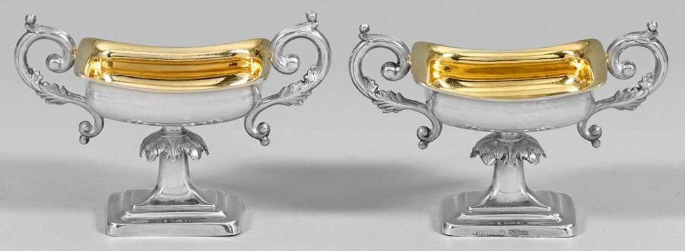 A pair of partial gilt salt cellars. Standard mark 84, city- assay master´s – and master´s mark.