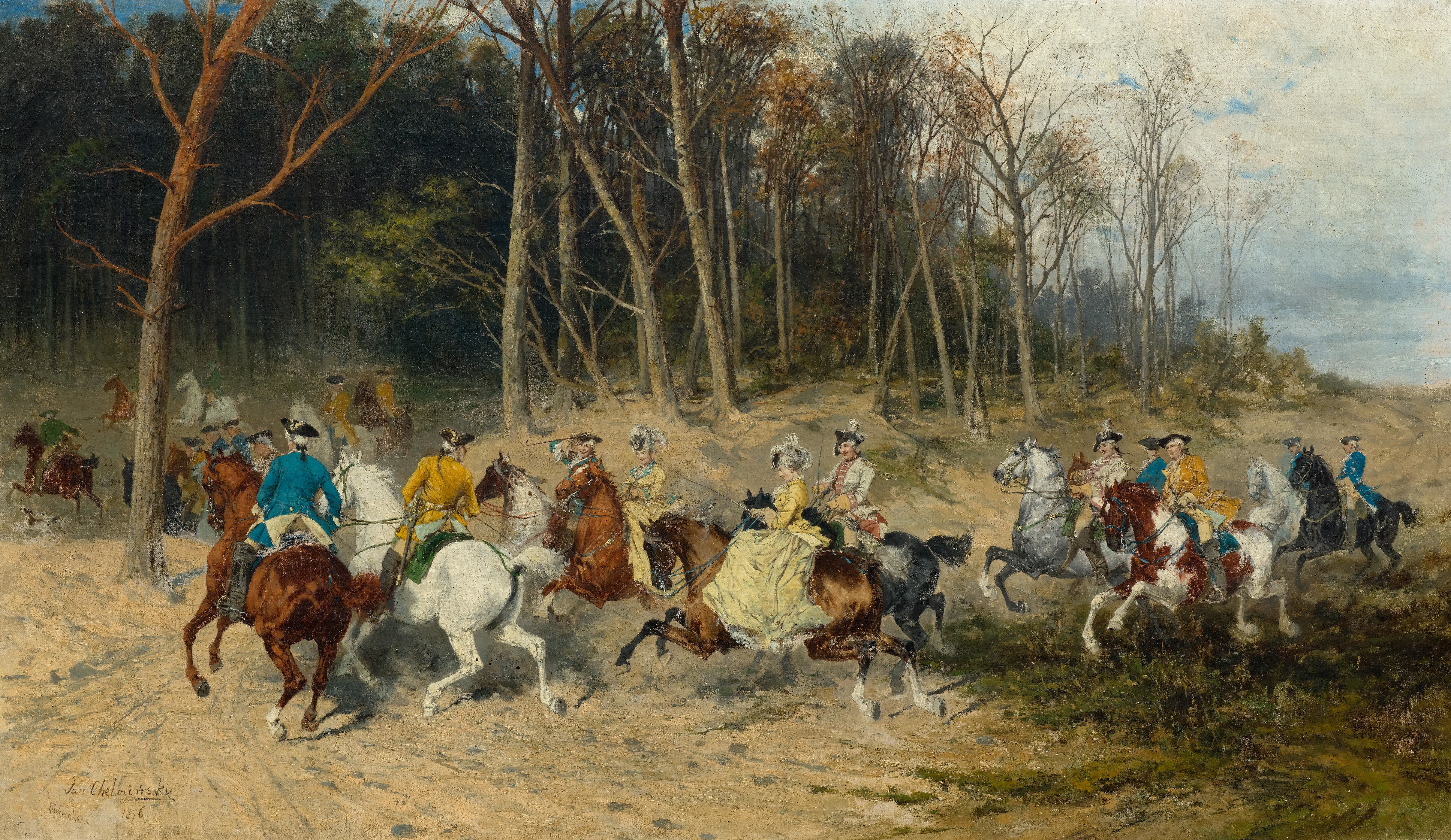 Lot 3232 – CHELMINSKI, JAN VAN (Bruzstóow 1851 – 1925 New York). Galante Jagdgesellschaft zu Pferd. 1876. Oil on canvas. Signed, inscribed and dated lower left: Jan Chelminski München 1876. 50.5 x 85 cm. Provenance: Swiss private collection. Estimate CHF 8 000 / 12 000 (€ 7 410 / 11 110). Koller. 09/22/17.