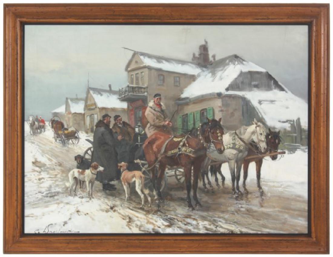 Lot 82. Czeslaw Wasilewski (1875-c1947, Poland) oil on canvas winter village street scene with Polish men and dogs gathered around a horse drawn carriage; signed lower left “Cz. Wasilewski”. In excellent condition with no damages, inpainting or repairs. 28.5 in. high x 38 in. wide – Frame : 33.75 in. high x 43.5 in. wide. Weight: 9 lbs.