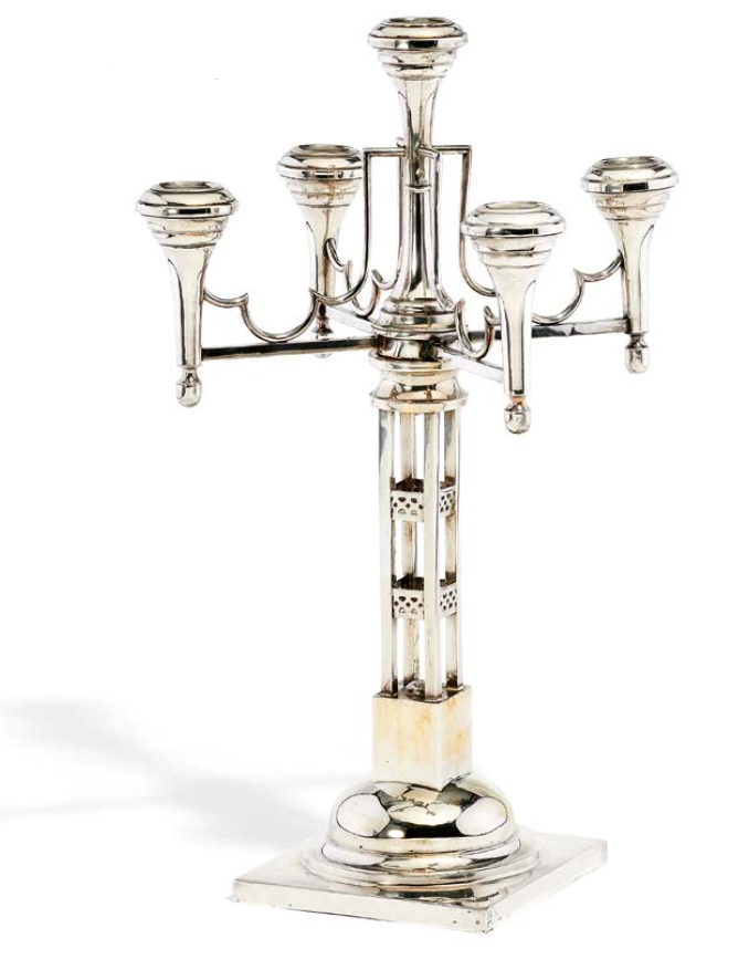 Silver. Domed foot on square base plate. The openly worked shaft made of four slender bases with geometrically pierced connecting pieces. The large five-flame candelabrum with funnel-shaped nozzles. Ca. 1650g. Height 59.5cm.
