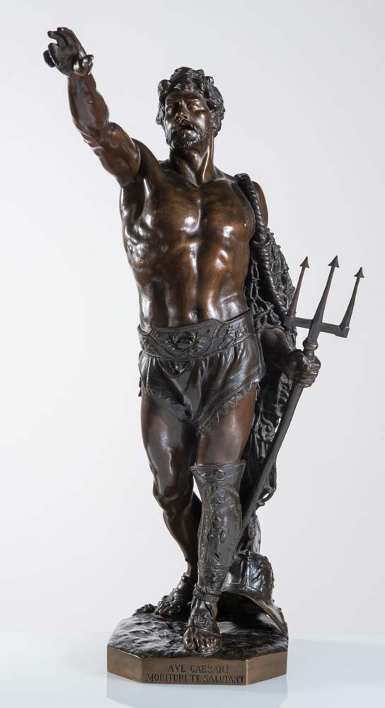 Bronze sculpture, signed on the base Pio Welonski Roma, inscription on the base ‘AVE CAESAR! MORITURI TE SALUTANT’ and mark ‘Fond. Nelli – Roma.’, H cm 66.5, base cm 21×21